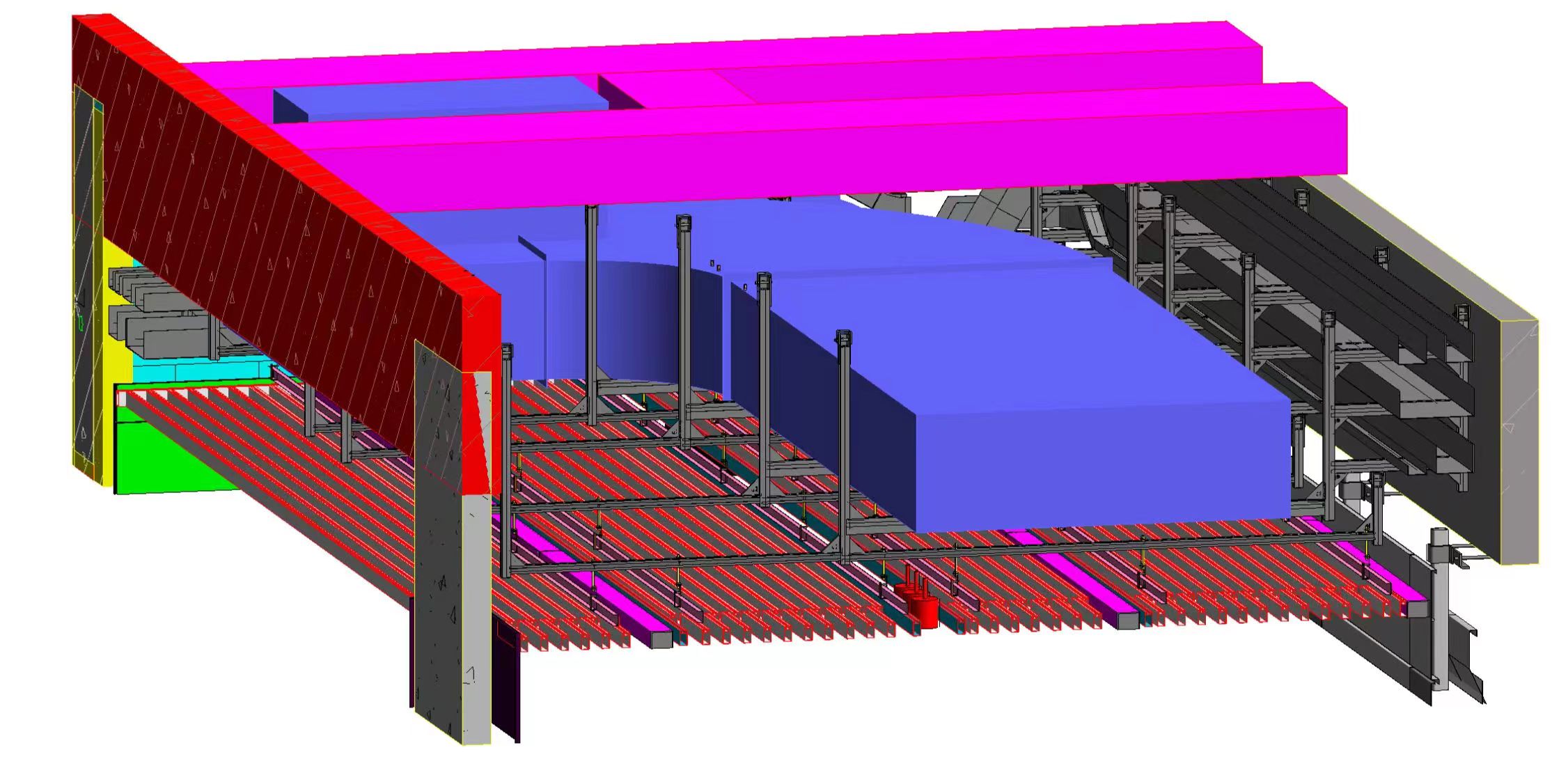 本工程分三個(gè)標(biāo)段,合計(jì)總建筑面積為56.1萬㎡,建筑最高高度34.8m,其中一、三標(biāo)段為多層大跨度鋼結(jié)構(gòu)廠房。眾所周知,對于鋼結(jié)構(gòu)廠房支架設(shè)計(jì)一直是行業(yè)內(nèi)的難題。華固充分利用BIM技術(shù),自主研發(fā)的成品